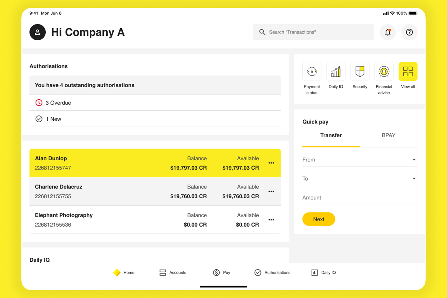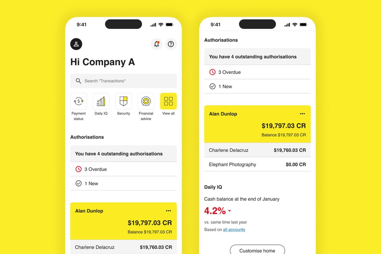 The new dashboard uses the consumer app's clean aesthetic as its foundation, then adapts for business priorities. A prominent "Outstanding Authorisations" section brings time-sensitive actions to the forefront. Tailored quick links address common business banking tasks. The result is visually modern and functionally superior.