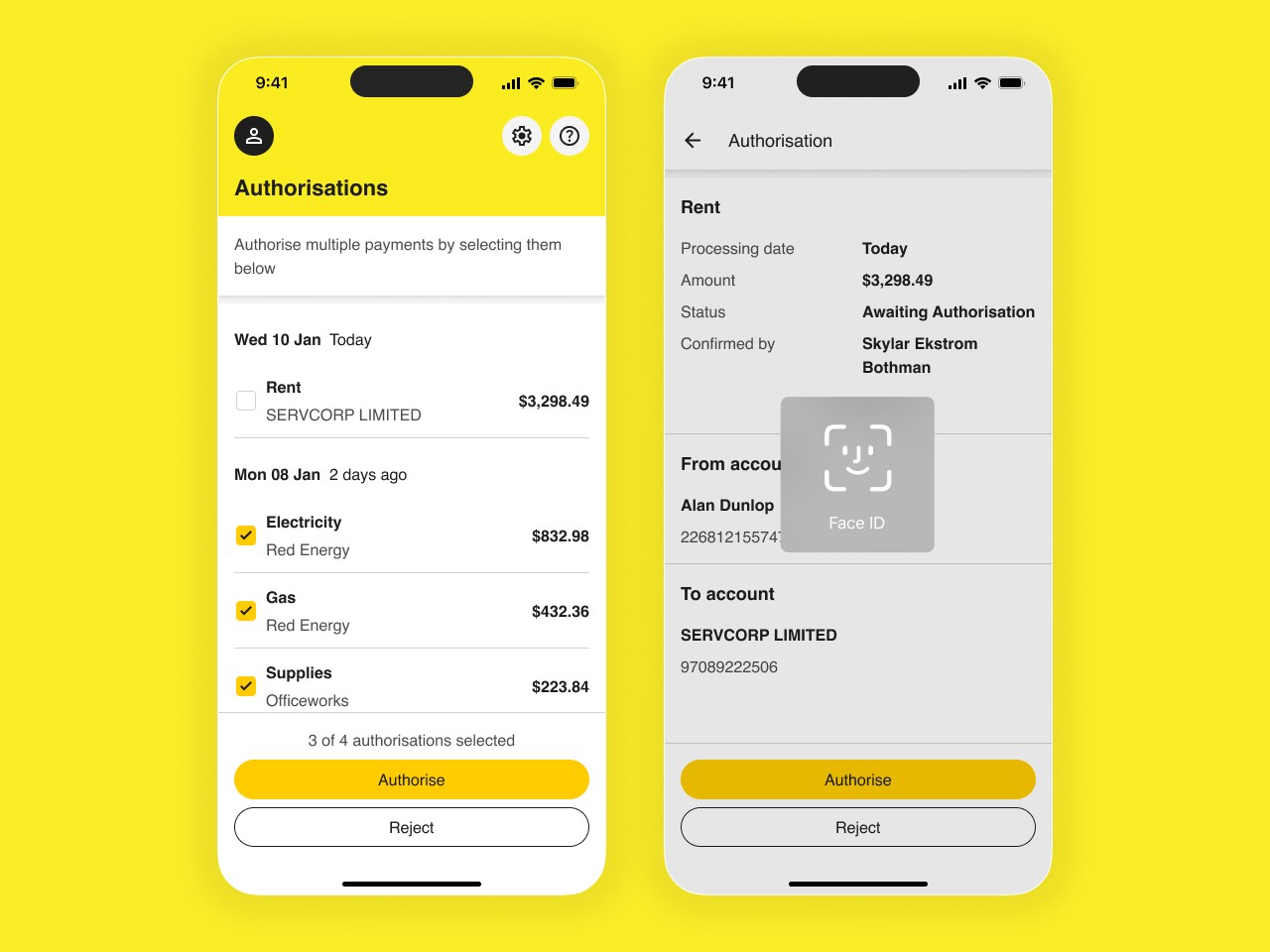 The payment authorisation flow was central to the happy path. We designed a clean list where users select one or multiple payments, then approve using Face ID. This single change transformed a core business process, making it feel fast and secure.