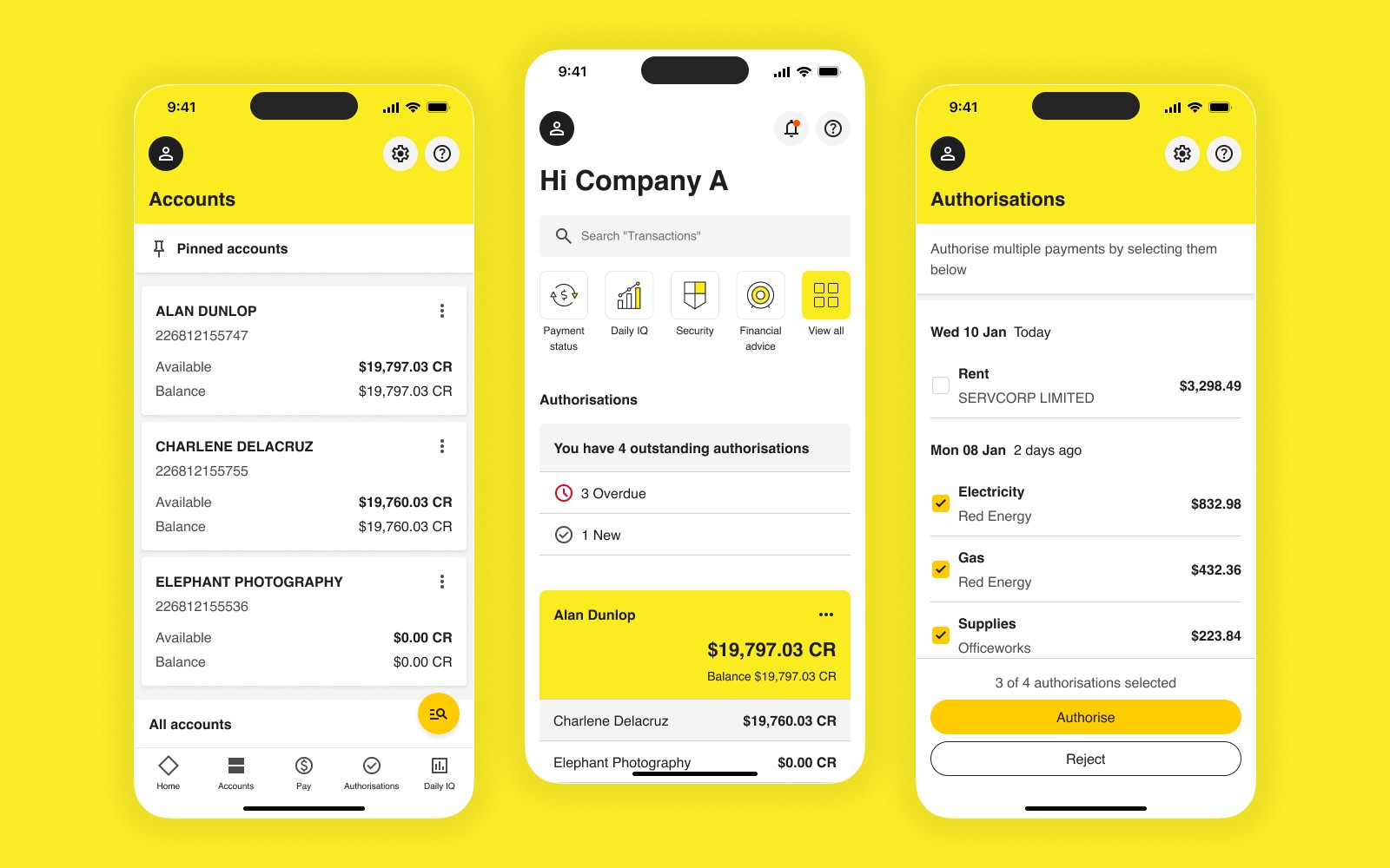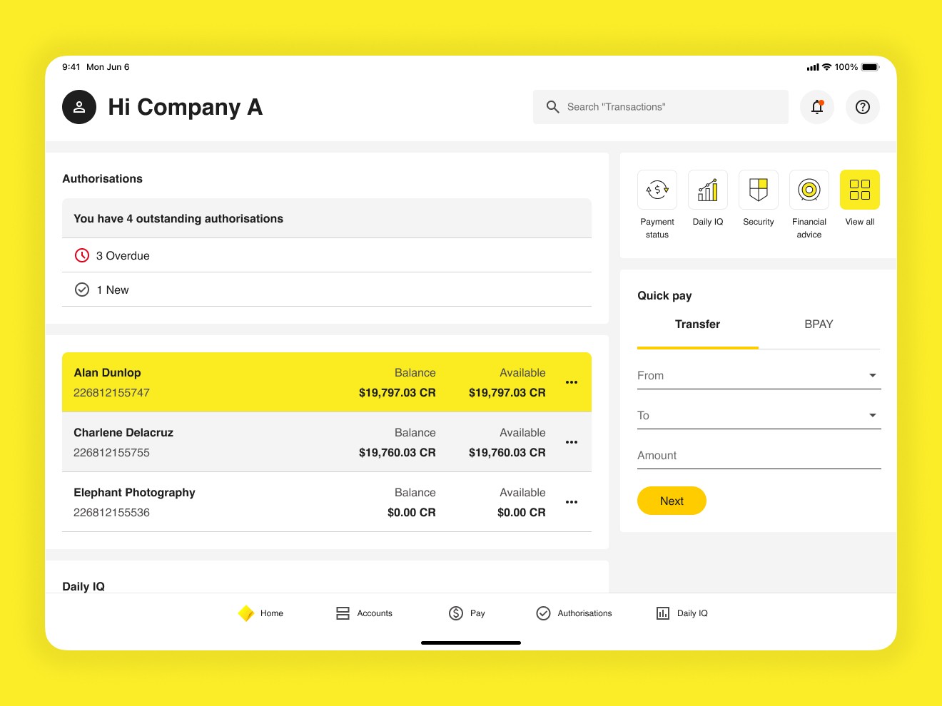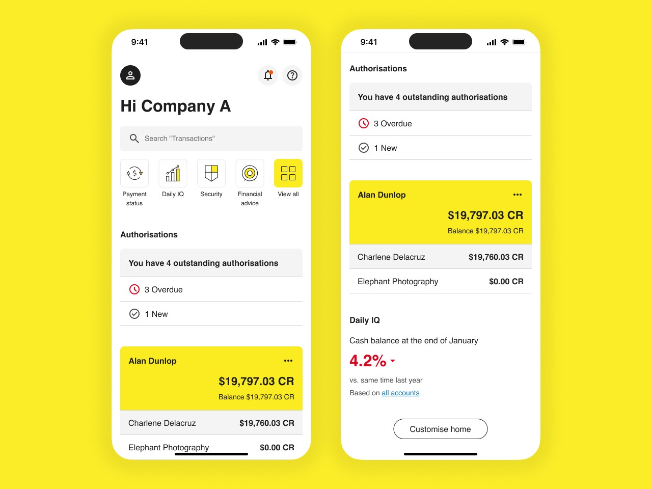 The new dashboard uses the consumer app's clean aesthetic as its foundation, then adapts for business priorities. A prominent "Outstanding Authorisations" section brings time-sensitive actions to the forefront. Tailored quick links address common business banking tasks. The result is visually modern and functionally superior.